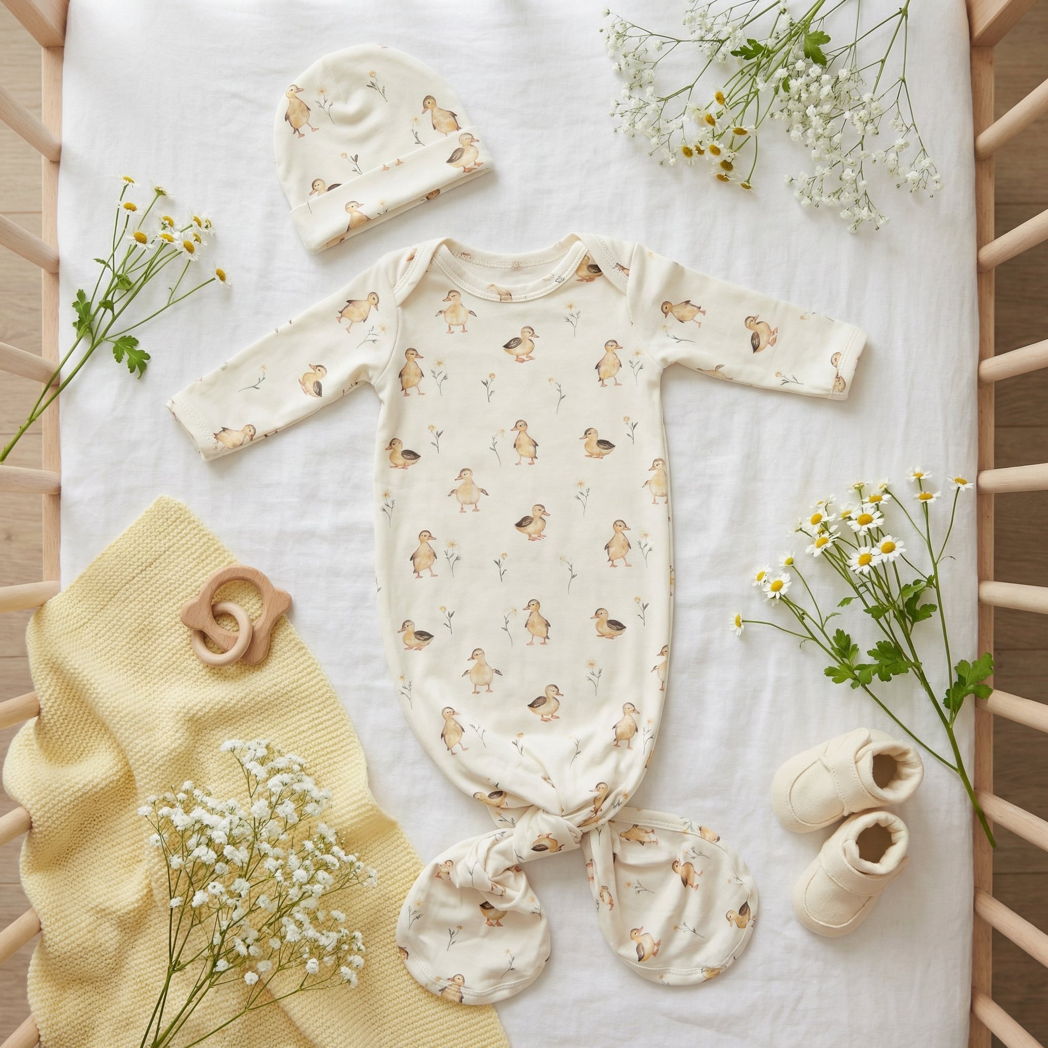 • Design Poétique : Un imprimé délicat de petits canetons aquarelle et de fleurs champêtres, parfait pour un style non-genré (unisex) ou un cadeau de naissance.